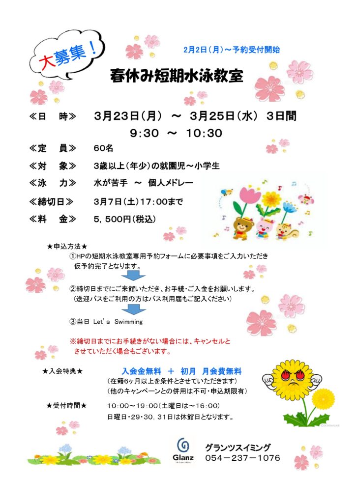 2026 春休み短期水泳教室のお知らせ 2026 2/05 お知らせ 2026年2月5日 日頃よりグランツスイミングをご利用いただき、誠にありがとうございます。 本日より春休み短期水泳教室の募集を開始いたします。 皆様のご参加を心よりお待ちしております。 https://forms.gle/zgwNNGFbZWTUr94X9 お知らせ 【スイミング】年末年始の営業についてのご案内